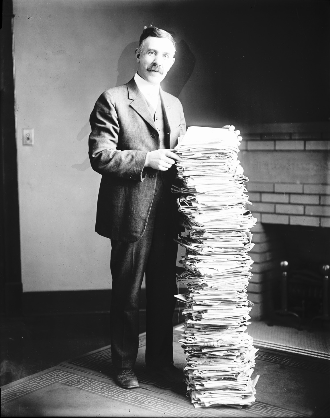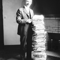 - Clarence E. Bisbee standing beside a stack of newspapers and other papers, fireplace in background.