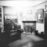 - Interior view of the Bisbee Studio. Fireplace and framed photographs visible.