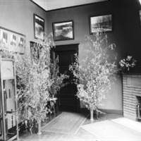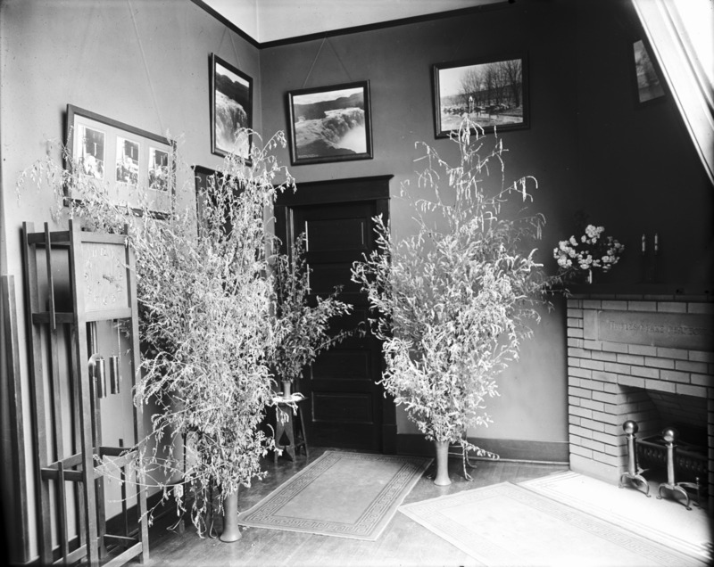 - Interior of Bisbee Studio. Tall plants, grandfather clock, framed photos, and fireplace are visible.