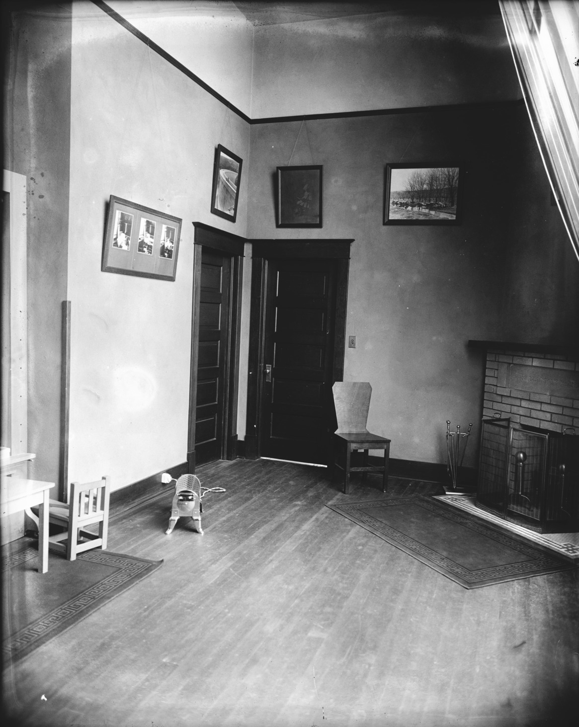 - Interior of the Bisbee Studio; room with slanted window, with chairs and props.