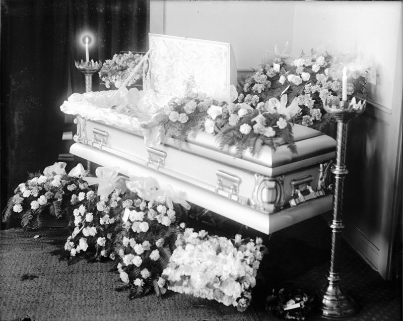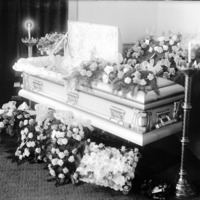 - Open coffin, with body visible, surrouded by flowers and two large candlesticks.