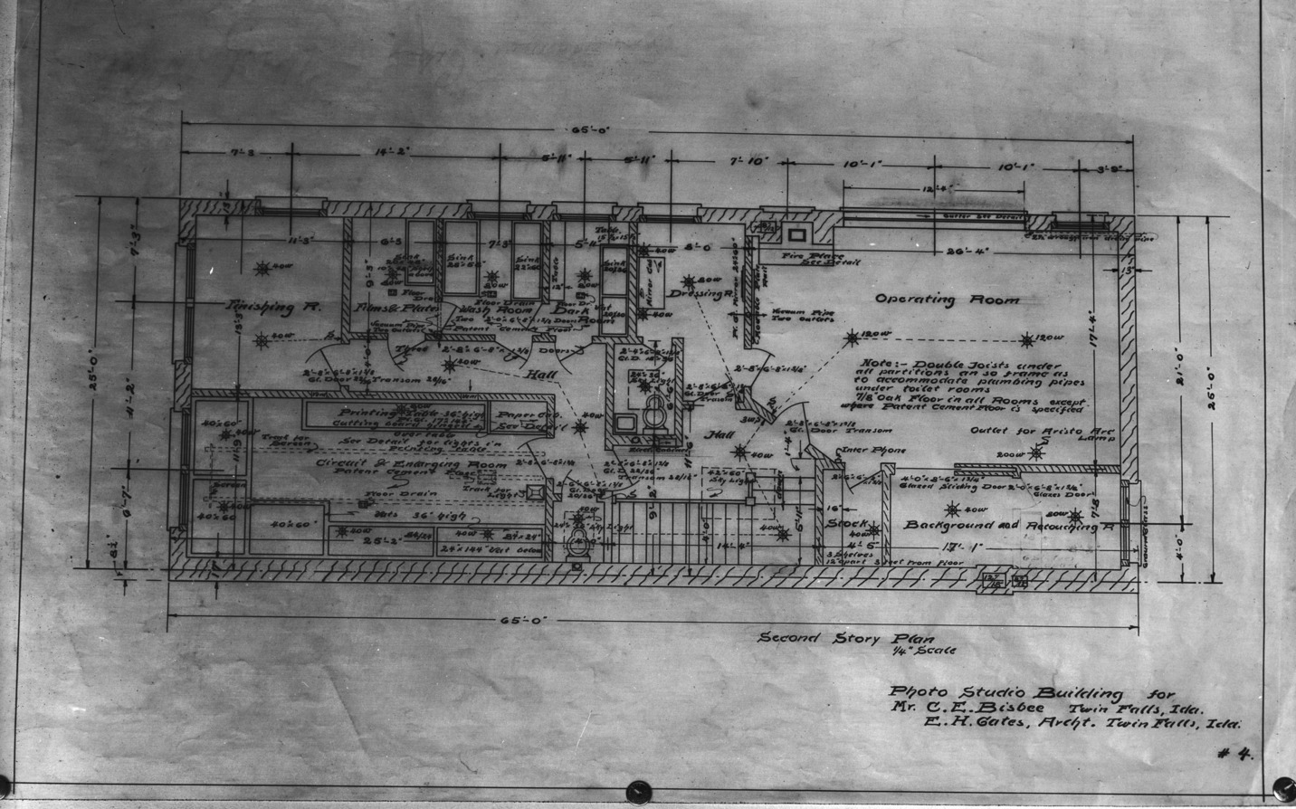 - Blueprints for the potential second floor of the Bisbee Studio. Plans drafted by Twin Falls architect Ernest Gates.