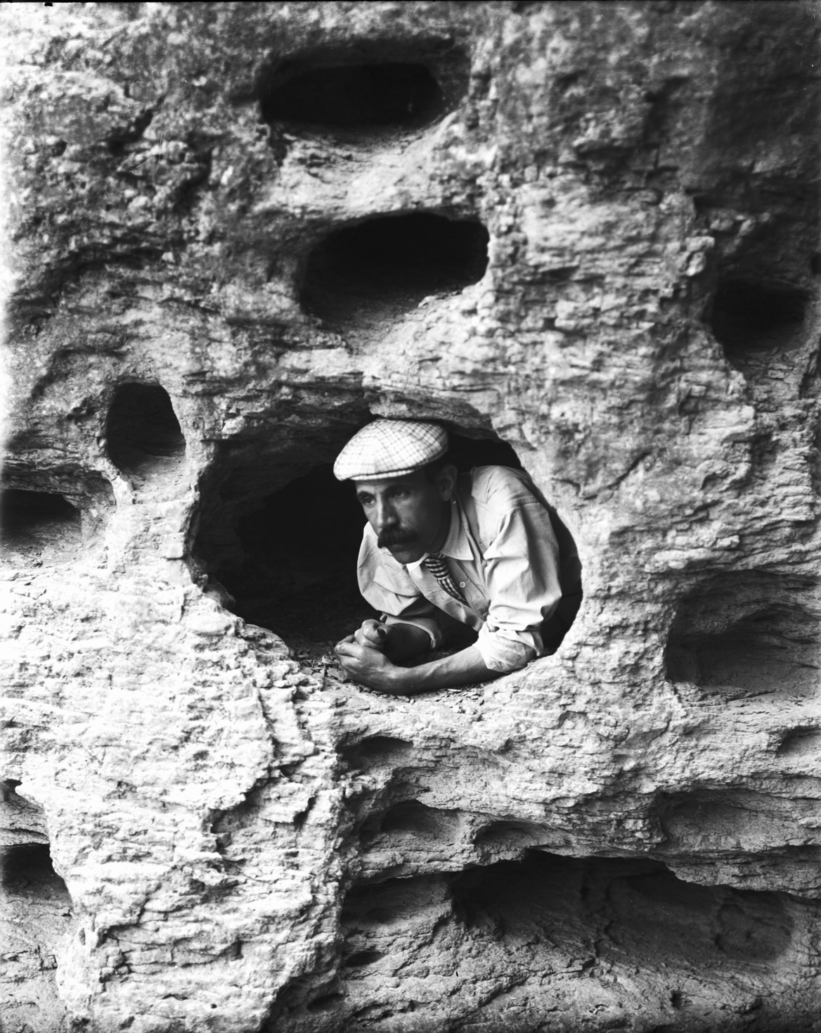 - Clarence Bisbee looking through a hole in a rock canyon wall.