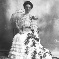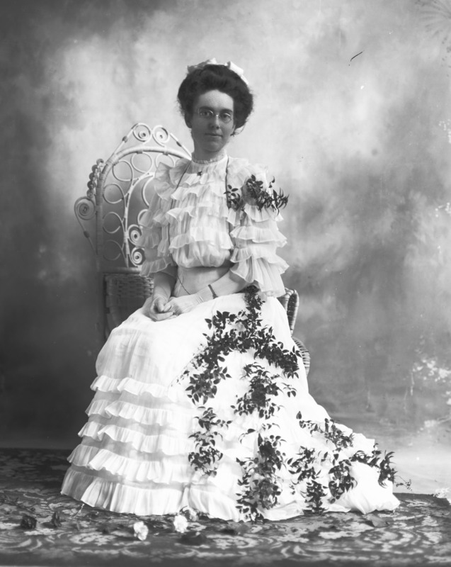 - Portrait of Jessie Bisbee, seated with greenery and flowers strewn about her person.