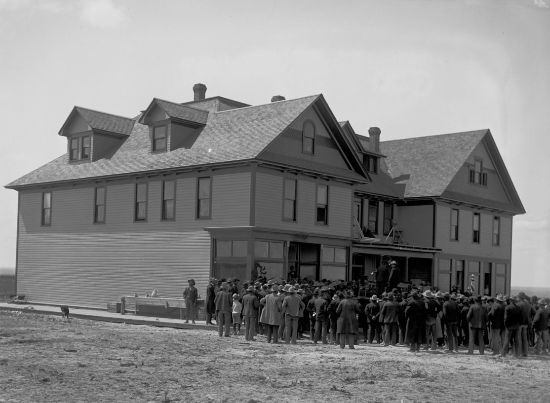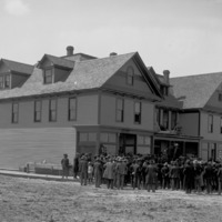 - Crowd of people in front of the two-story Buhl Hotel shortly after construction.