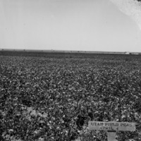 - Field of Utah peas, planted April 4, with a few, scattered buildings in the distance.