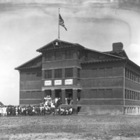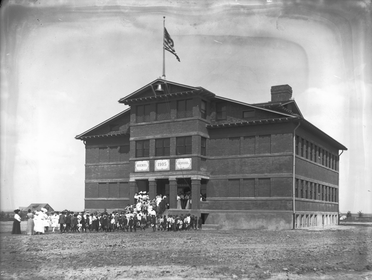 - A crowd of people, mostly students in front of and entering Bickel School, soon after construction.