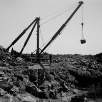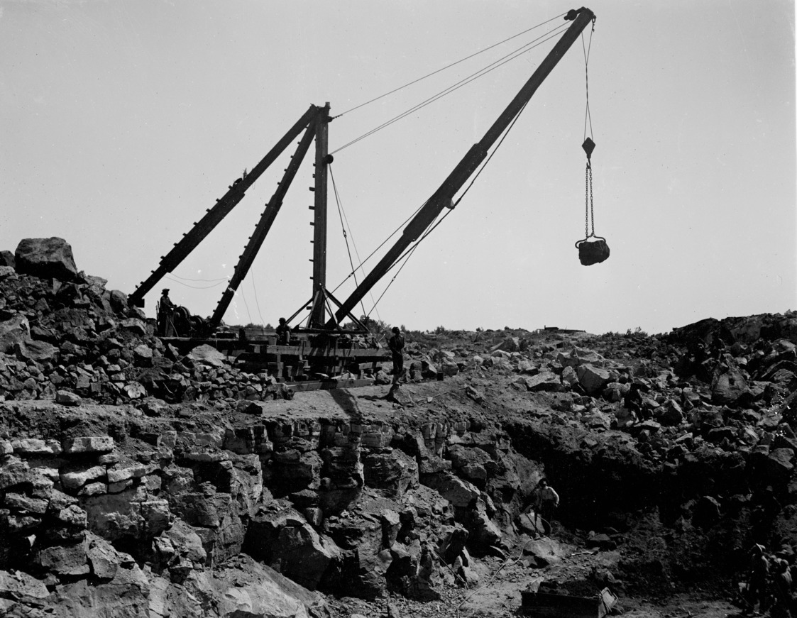 - Men operating a large derrick crane; lifting rock from a canal channel.