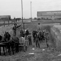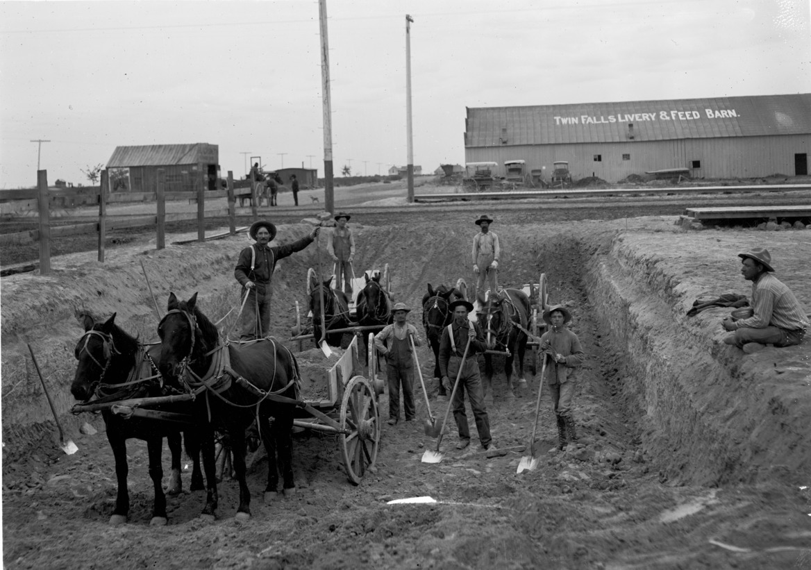 Teams of men and horses excavate a site. Twin Falls Livery and Feed Barn and a blacksmith shop in the background.