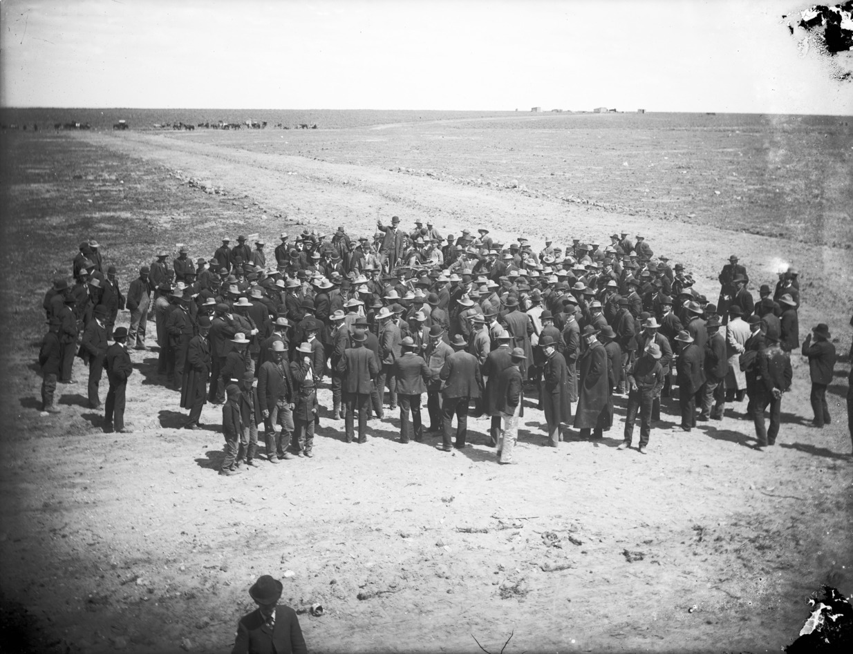 - A large group of men standing in a field; horses and/or cattle and a townsite in the distance.