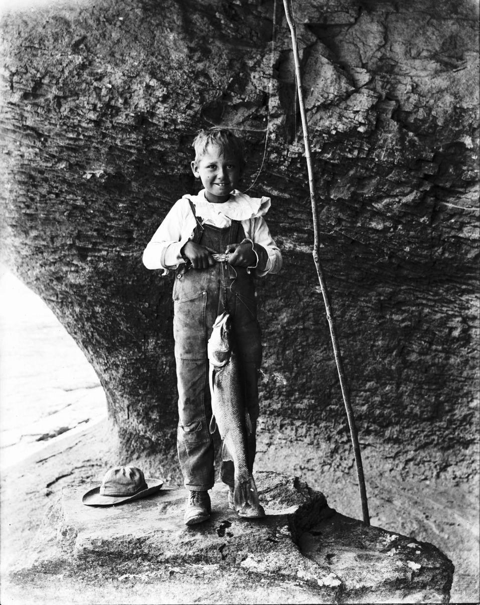 - A boy stands in front of a canyon wall with a stick fishing pole and showing off a caught fish.