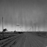 - A wide, windy thoroughfare lined by phone lines and newly planted trees; a buggy with passengers turning onto a side road. May be Blue Lakes Blvd.