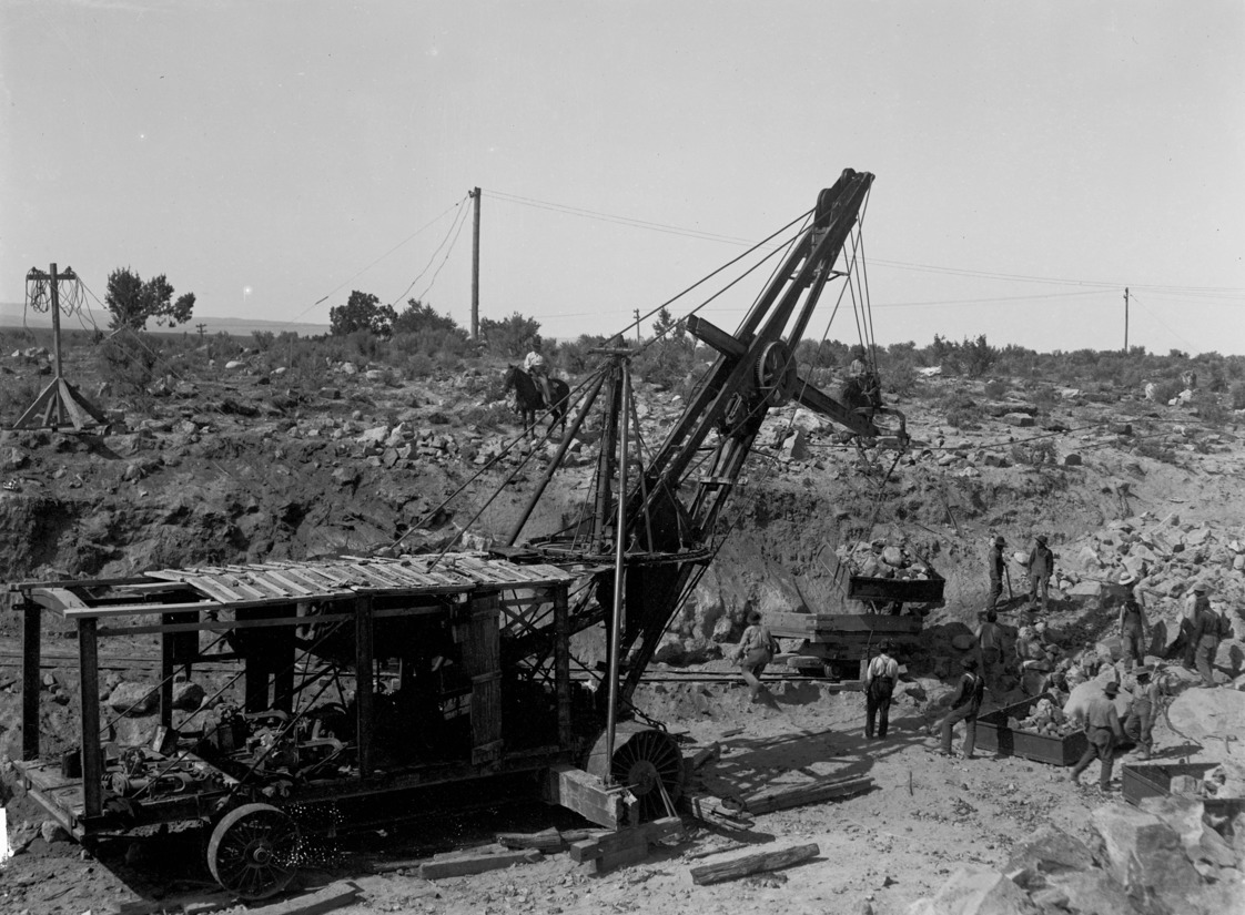- Construction crews and a mobile crane, moving large boxes of rock in a canal bed.