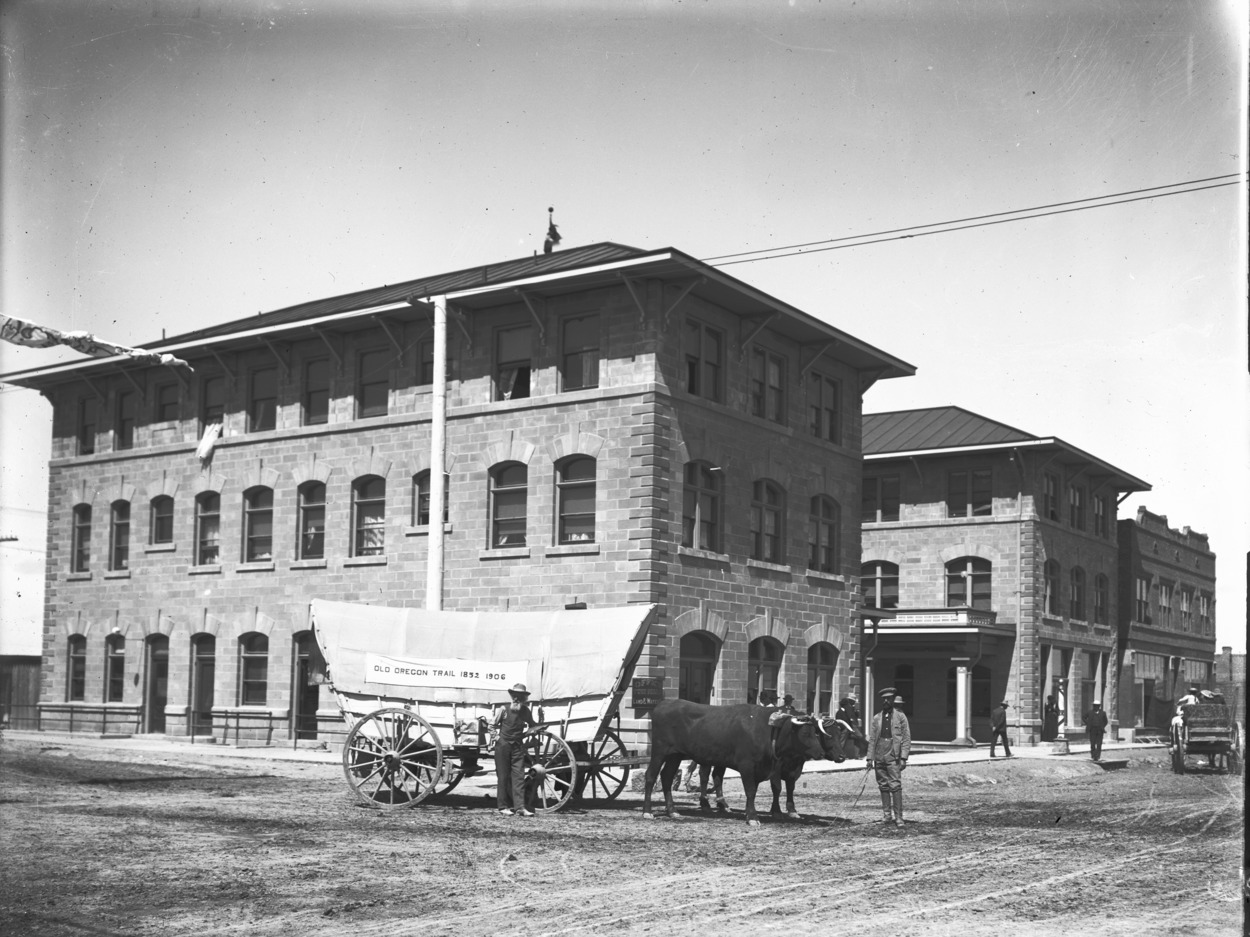 - Ezra Meeker, his ox-team, and wagon in front of the Hotel Perrine.