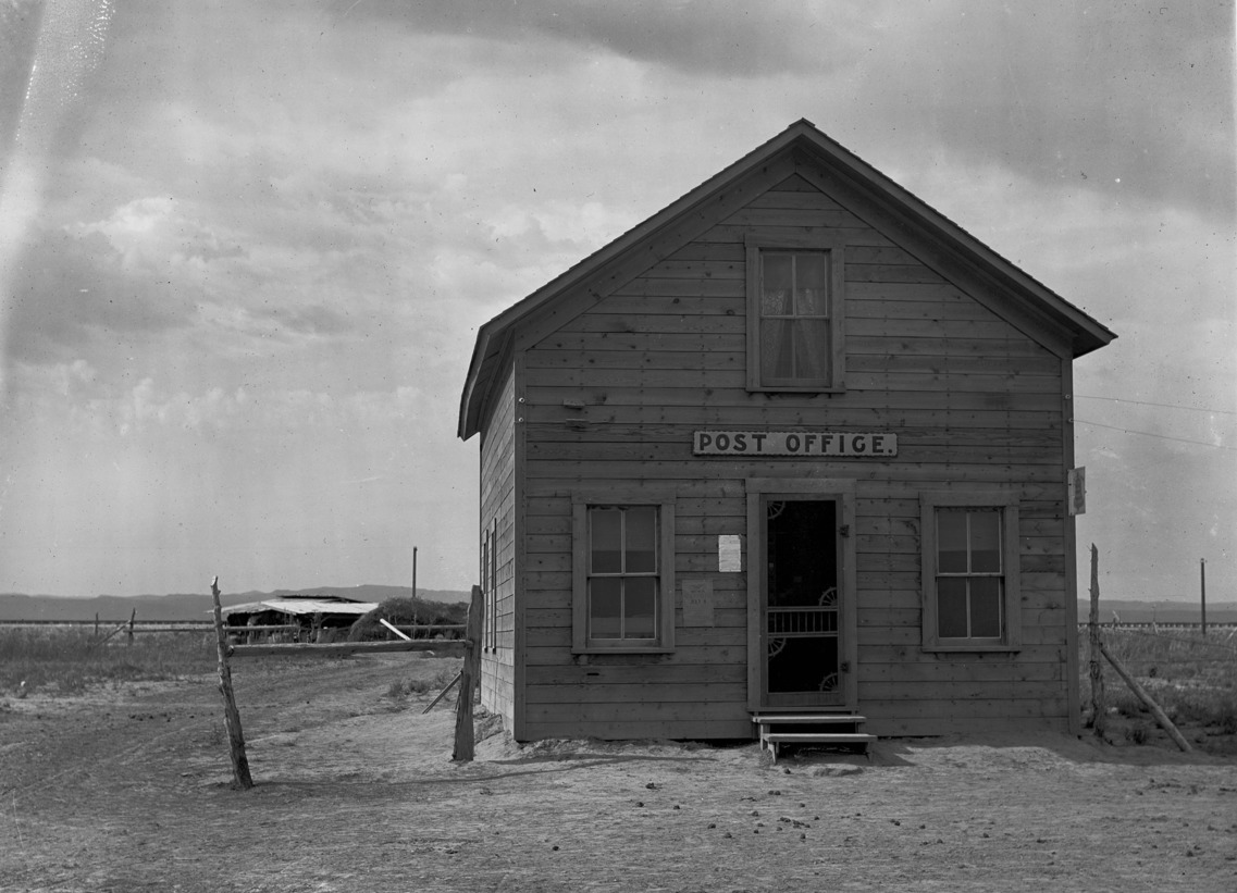 - A frame building identified as Post Office; a rough-hewn hitching post stands at left, and a low-slung barn or other outbuilding in the background. Possibly at Rock Creek (one of the signs reads "Rock Creek, July 4").