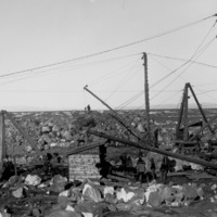 - Construction crews and derricks moving rock in a canal bed.