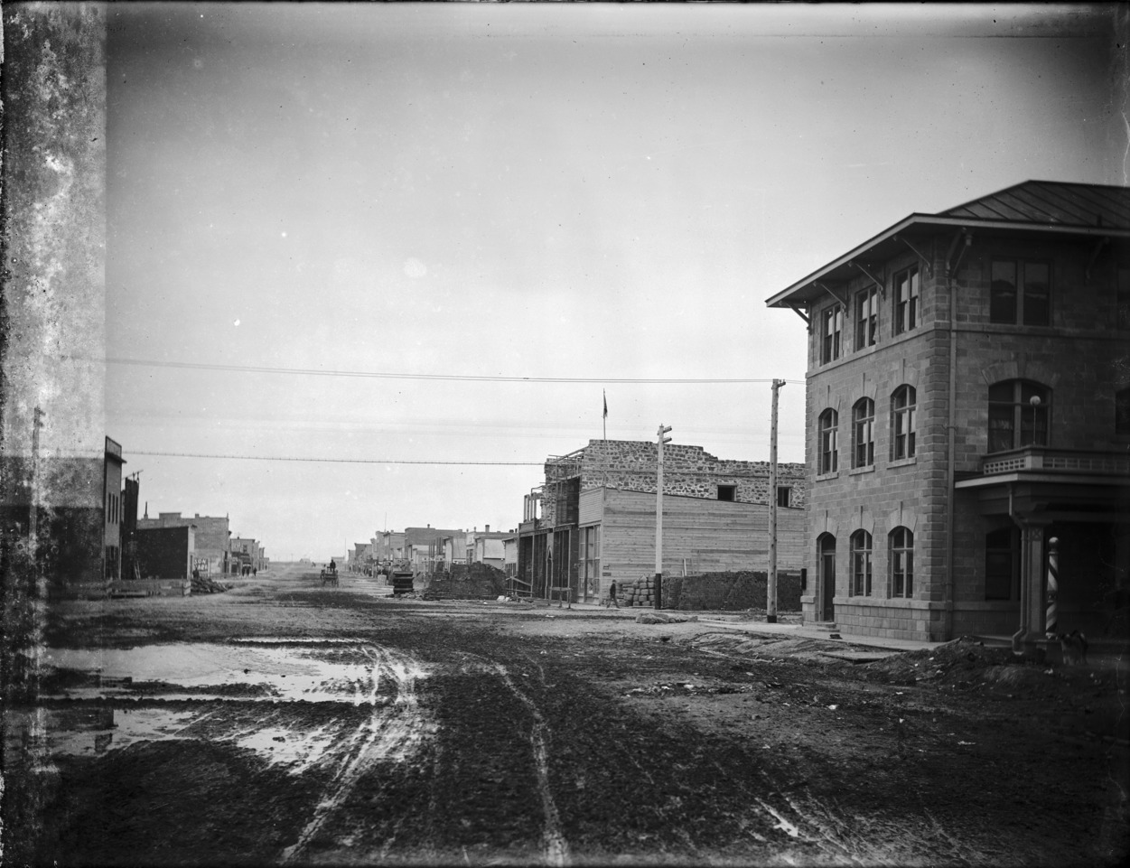 - View of Main Ave, looking southeast; Hotel Perrine in the foreground. Construction underway along street.