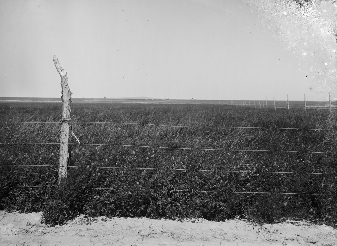 - View of a field beyond a wire fence.