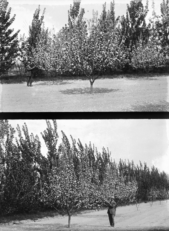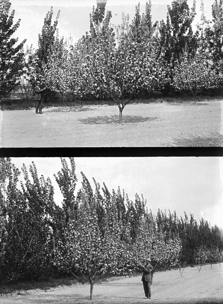- Two photos of a man standing beside a flowering fruit tree.