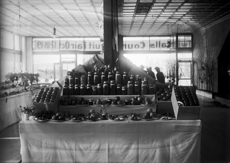 - Produce display at the Fair; a sign in the window reads "Twin Falls County Fruit Fair Oct 17-18-19"