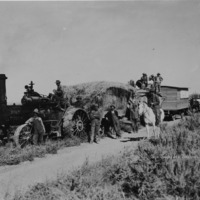 - "Sam Swanson's Thresher;" A group of men posing with steam engine thresher. Horses and wagons also seen.