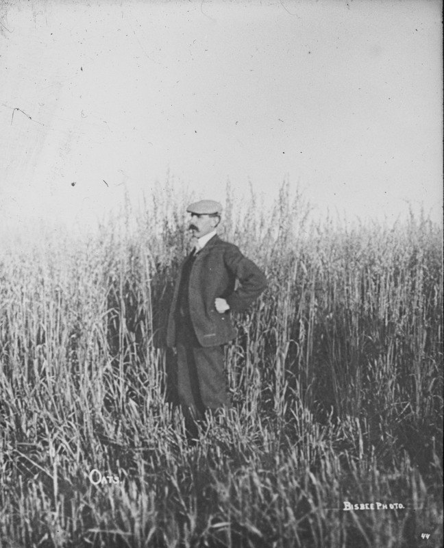 - Oats; Clarence Bisbee standing in a field of oats.