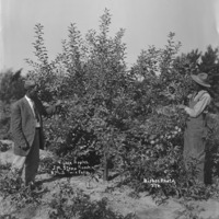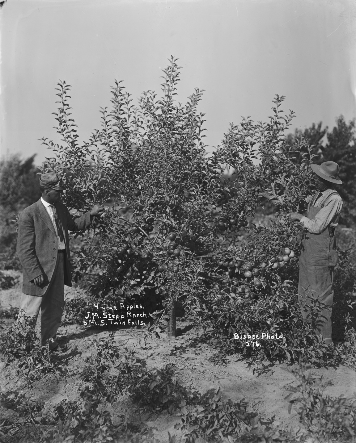 "4 year Apples, J.M. Stepp Ranch, 5 miles south Twin Falls;" Two men standing beside fruit laden tree