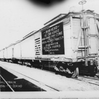 - "By special train, Wisconsin to to Idaho; " A train car with a sign that reads, " 300 head, 10 car loads; High Grade Dairy Cows Sold to Sterling Dairy Products Co. by Edgewater Stock Farms; Fort Atkinson, Wisconsin."