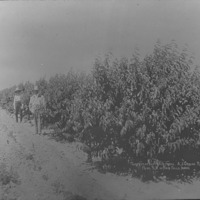 - "Three year old peach trees. A.J. Greene Ranch, 1 1/2 Miles Southwest of Twin Falls, Idaho;" two men stand beside a row of peach trees.