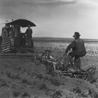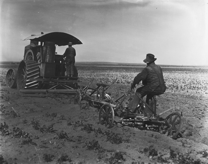 - "Plowing Twin Falls Tract. P.H. Smith Ranch;" Two men plowing with a steam tractor.