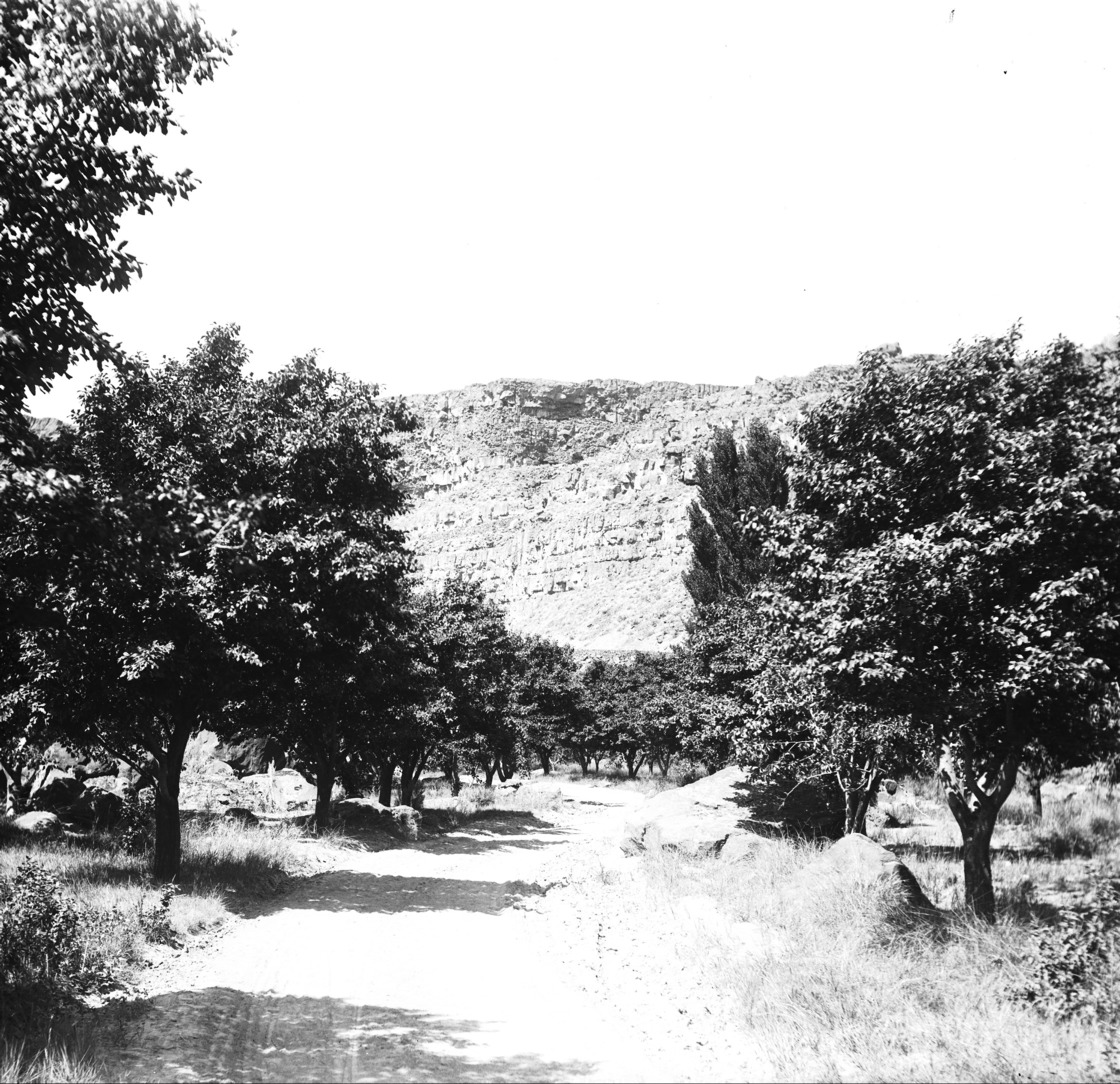 - Trees line a dirt road in the canyon.