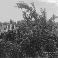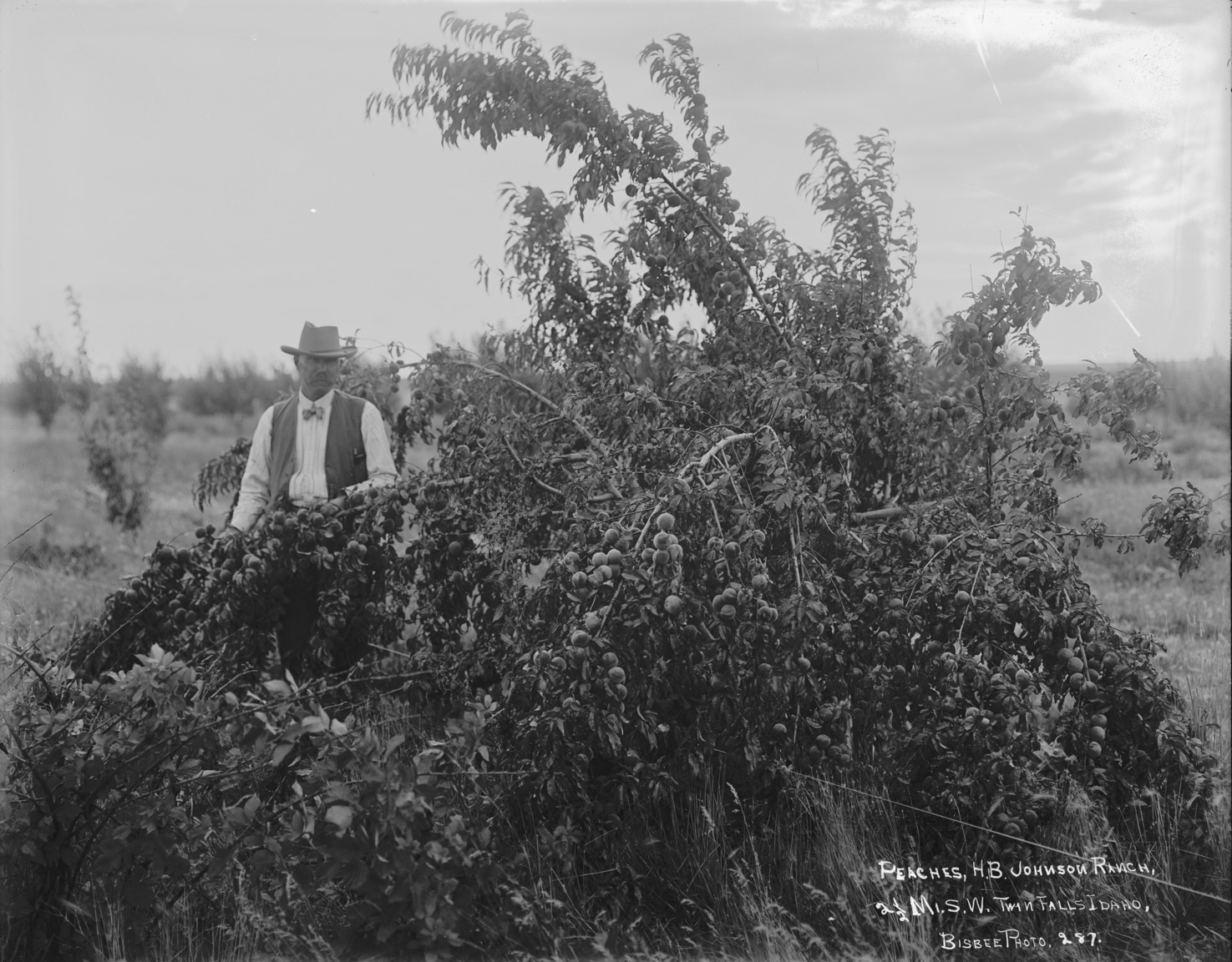 "Peaches, H.B. Johnson Ranch, 2 1/2 miles southwest Twin Falls, Idaho;" man beside a fruit tree.