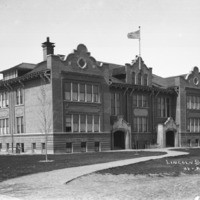 - "Lincoln School;" with landscaping, soon after construction. {This building was demolished in 1975.}