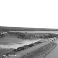 - "Milner Dam;" view from above the gates of the dam. A man stands on the berm.