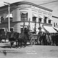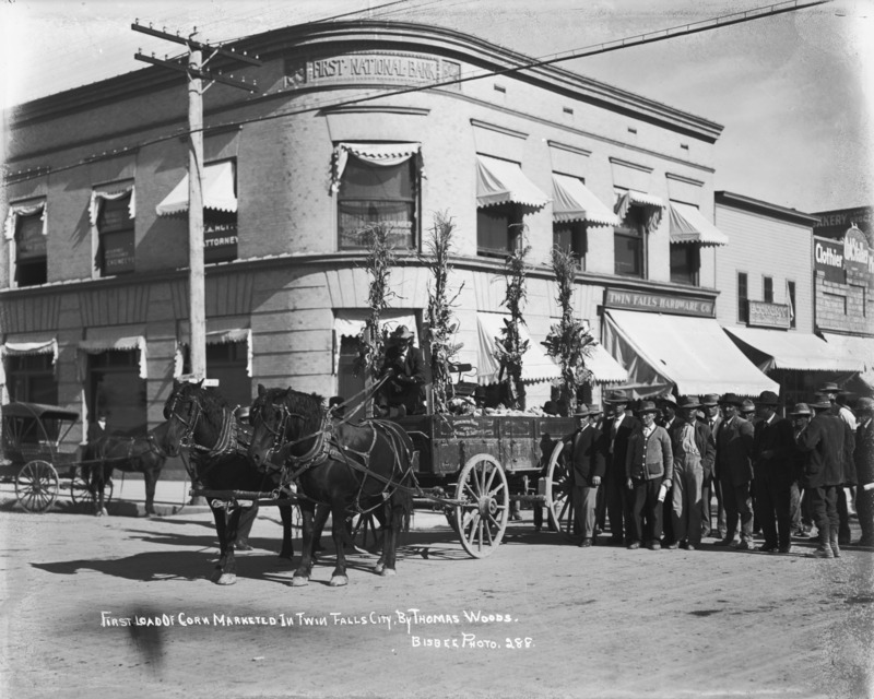 "First Load of Corn Marketed in Twin Falls City, by Thomas Woods;" A wagonload of corn surrounded by men, at the corner of Main Street and Shoshone Street. First National Bank, Twin Falls Hardware Co., O.A. Stalker Clothier in background