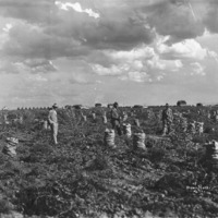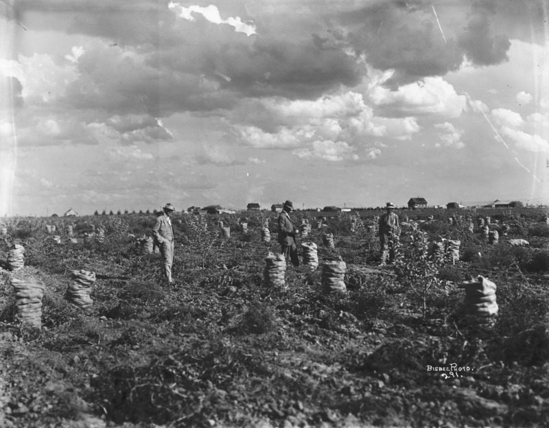 - Three men standing in a potato field, among sacks of potatoes; buildings visible in the distance.