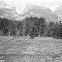 - "The Tetons;" treeline in front of mountains