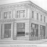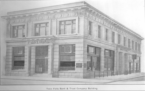 Twin Falls Bank and Trust Company Building. Also visible: George Herriott, Attorney at Law; Roberts Daly Company, Orchard Lands; Mark M. Murtaugh Consulting, Hydraulic and Construction Engineer; Straus Glauber Clothing (building next door on Shoshone); Dr. McAtee, Dentist (building next door on Main); photo engraved from 339