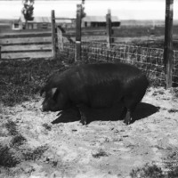 - "Duroc Jersey. MacWatter's Ranch;" a large pig in a fenced pen; outbuildings can be seen in the distance