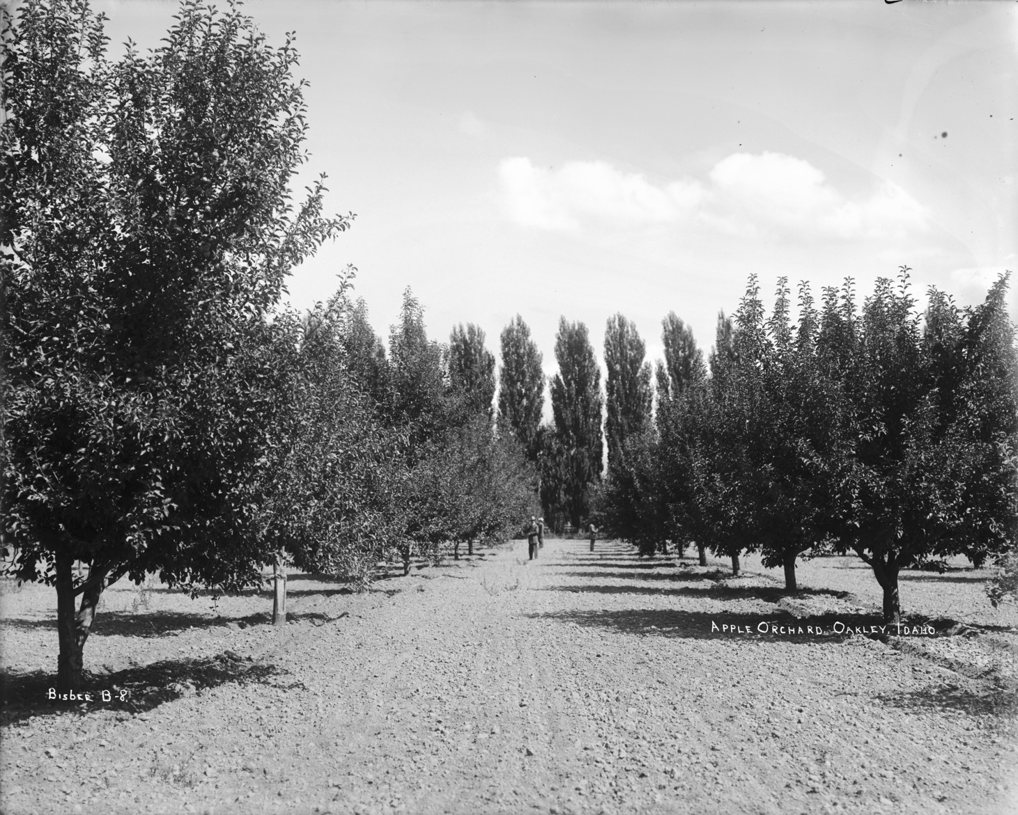 - "Apple Orchard. Oakley, Idaho;" three men stand among a grove of mature apple trees