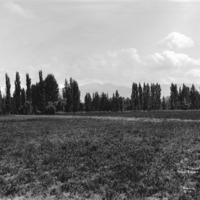 - "Idaho, Near Beautiful Oakley;" a field lined with trees; Albion Mountains in the background