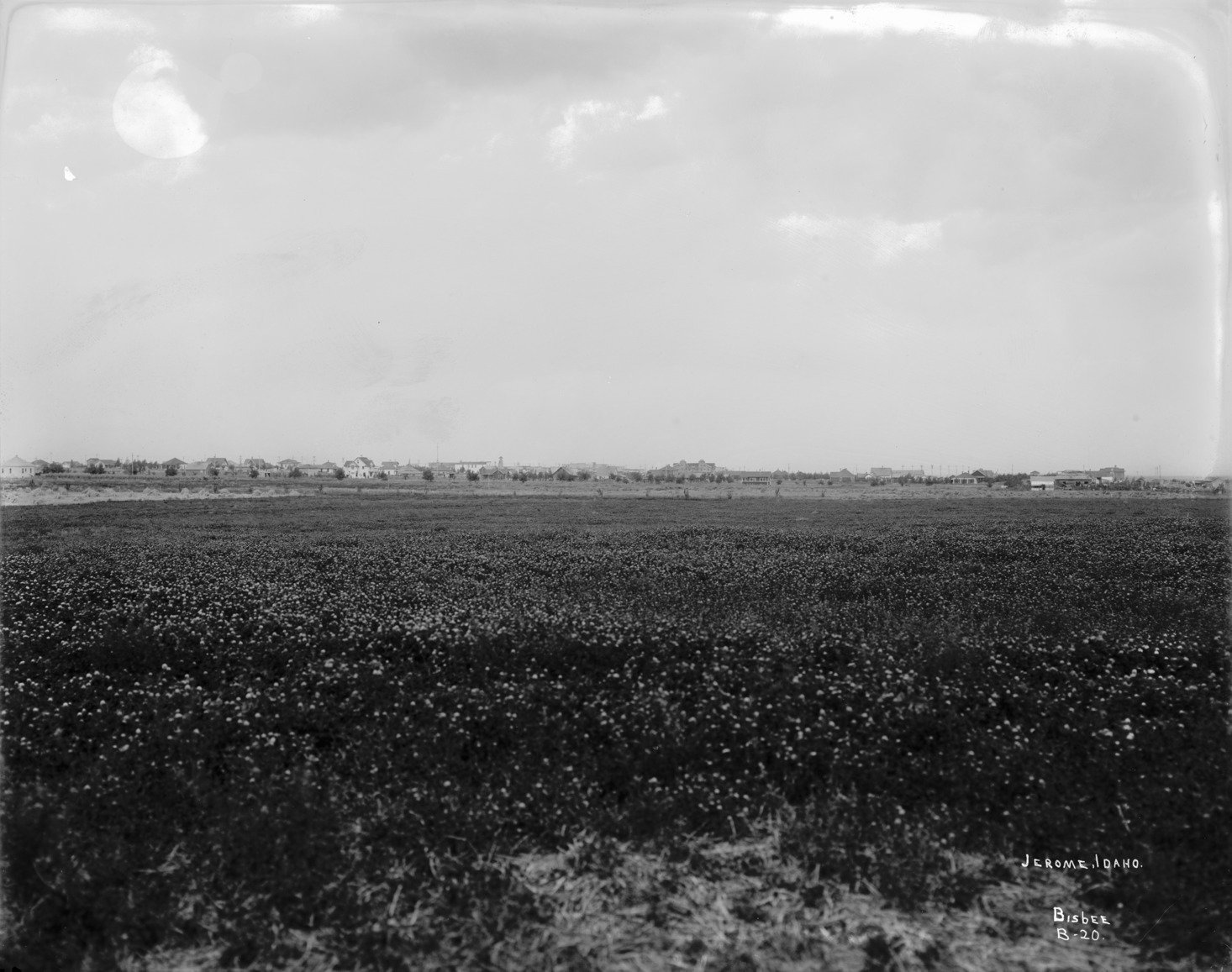 - "Jerome, Idaho;" wide view of Jerome, looking west; several buildings can be seen in the background, including the North Side Inn