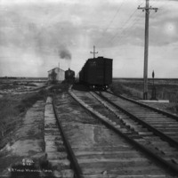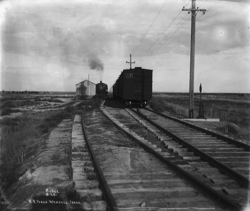 - R. R. Yards. Wendell, Idaho;" two trains pass on the railroad tracks beside a small station (depot)