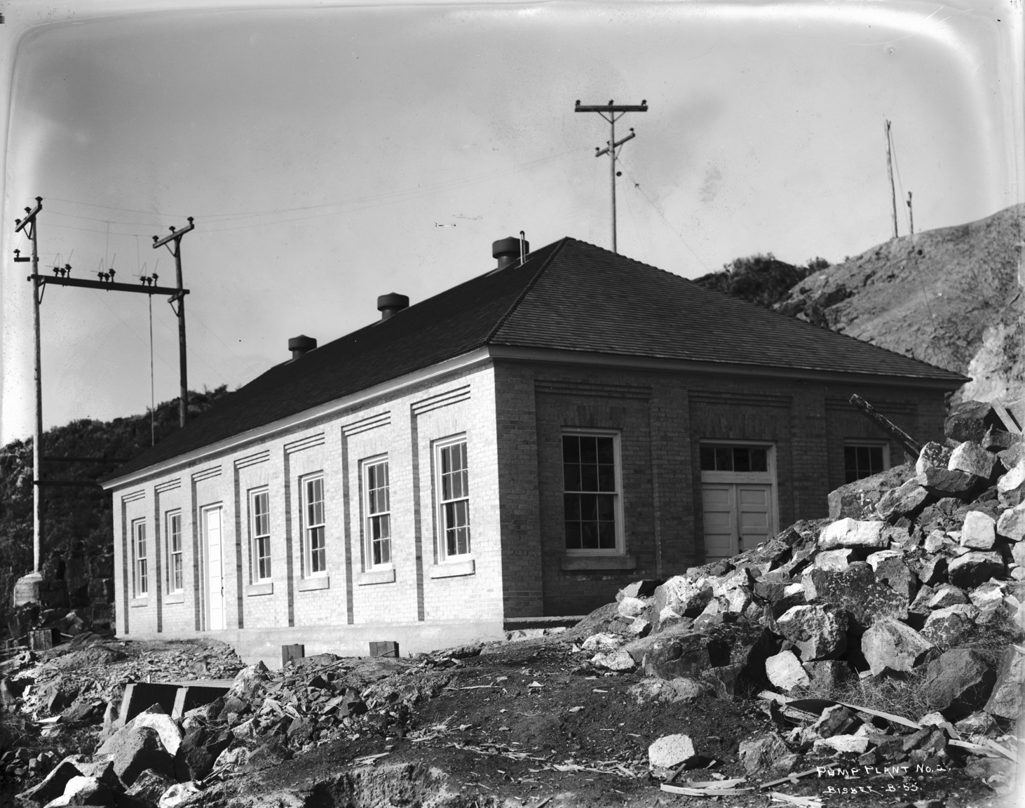 - "Pump Plant #2;" brick pump plant building on the side of a hill
