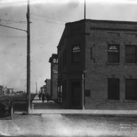 - "Jerome, Idaho;" looking down a street in Jerome; visible are the First National Bank with the office of Dr. Beistel, physicial and surgeon; a furniture store; Light and Power. Several people walk along wooden sidewalks