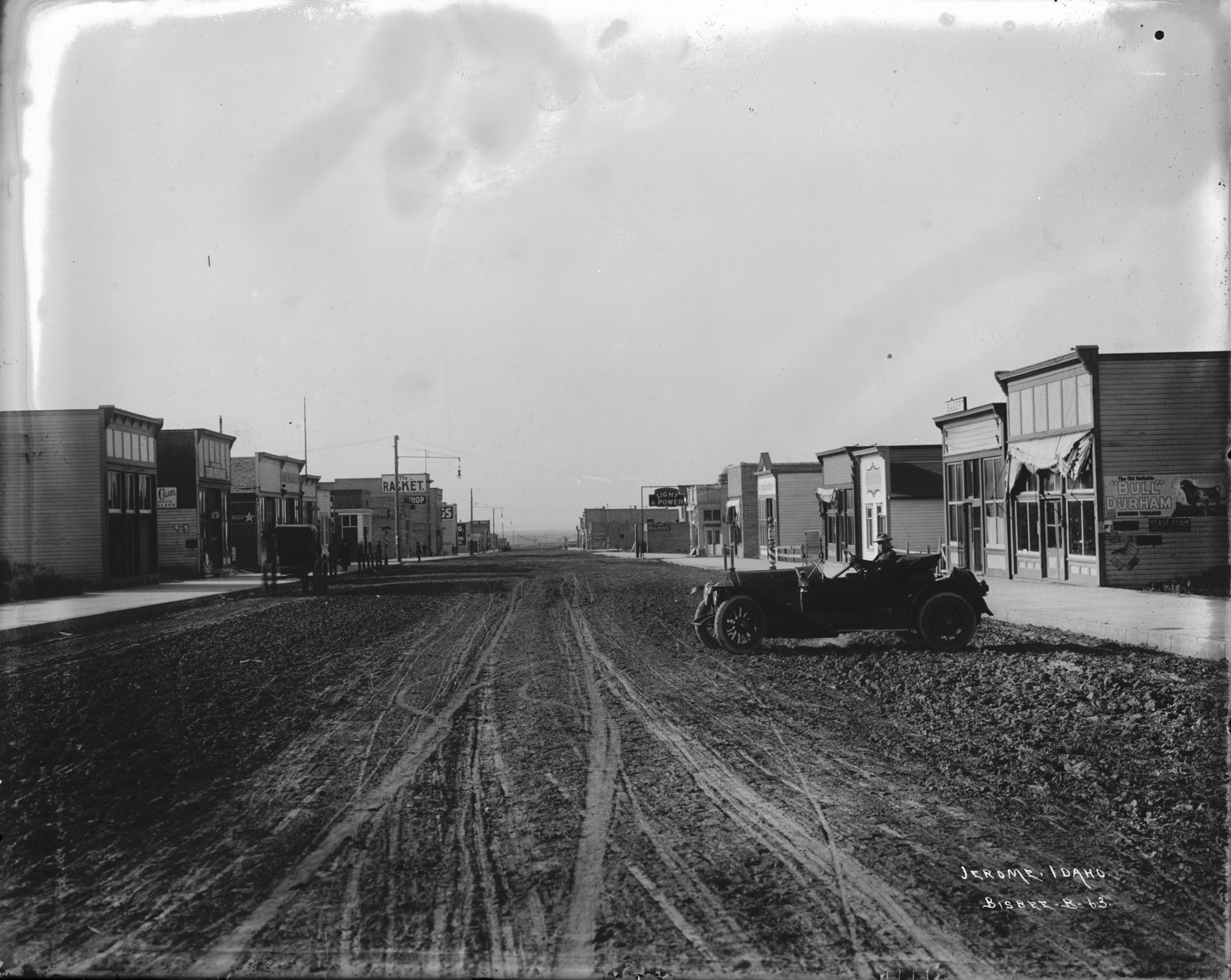 - "Jerome, Idaho;" a look down a street in Jerome, with a man in an automobile (car) parked in the street. Also visible are signs advertising cigars and tobacco; "The Racket;" the North Side News; Real Estate; Light and Power; a barber, and a bakery.