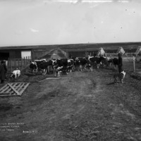 - "Holstein Dairy Herd; Overbrook Farms; Jerome, Idaho;" several men, and a dog, stand alongside a herd of cows as they direct them down a fenced lane into a pasture.