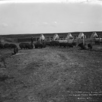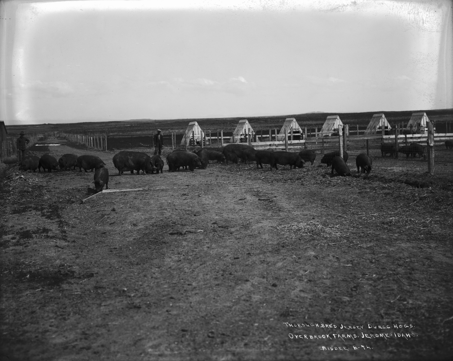 - "Thoroughbred Jersey Duroc Hogs; Overbrook Farms, Jerome, Idaho;" two men stand among several pigs in a fenced lane.