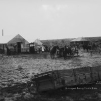 - "Surveyor's Camp, North Side; men, teams of horses, and buggies stand in front of a couple of wood frame buildings and a tent among the sage brush. A wagon box without the wheels is visible in the foreground.