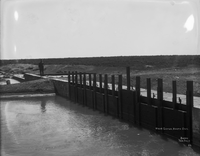- "Head Gates, North Side;" a man stands on a rock wall leading to several canal gates
